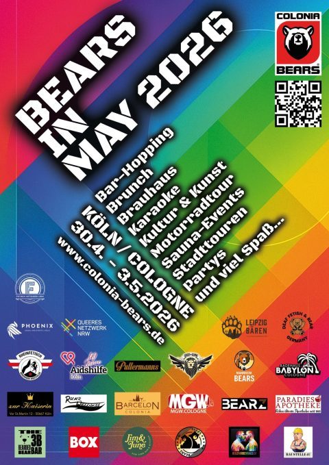 Als wir am 14. Juli 2025 den Termin für unser erstes Bärentreffen BEARS IN MAY 2026 bei Facebook bekannt-gaben, gab es zu diesem Zeitpunkt seit vielen Jahren kein ähnliches Event mehr in Köln. Das haben wir geändert und nun ist es bald so weit und unser Bärentreffen BEARS IN MAY 2026 startet am 30. April 2026! Am langen 1.-Mai-Wochenende vom 30. April bis 3. Mai 2026 laden wir die nationale und internationale Bärencommunity zu BEARS IN MAY 2026 ein.